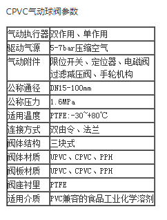 CPVC气动球阀,重量轻、耐腐蚀性强,被应用于多个领域,如一般纯水和生饮水的管路系统、排水和污水管路系统、盐水和海水管路系统、酸碱和化学溶液系统等多个行业,品质得到广大用户的认可。外型结构紧凑美观、本体重量轻容易安装、耐腐蚀性强,应用范围广、材质卫生无毒、耐磨损、容易拆卸,维护简单易行设计依据:ANSI JIS DIN GB 工作压力:0.6-1.0MPa 温度范围:32°F to 140°F(0℃ to 80℃)